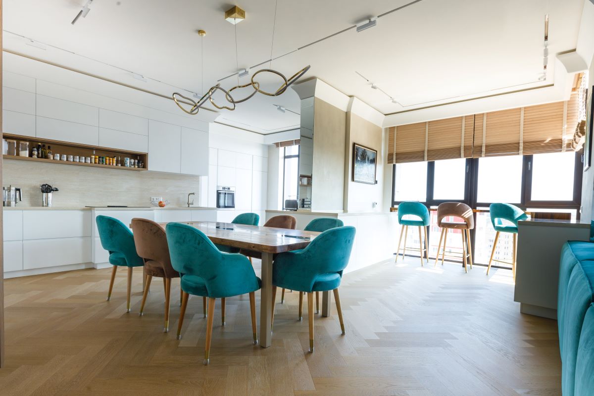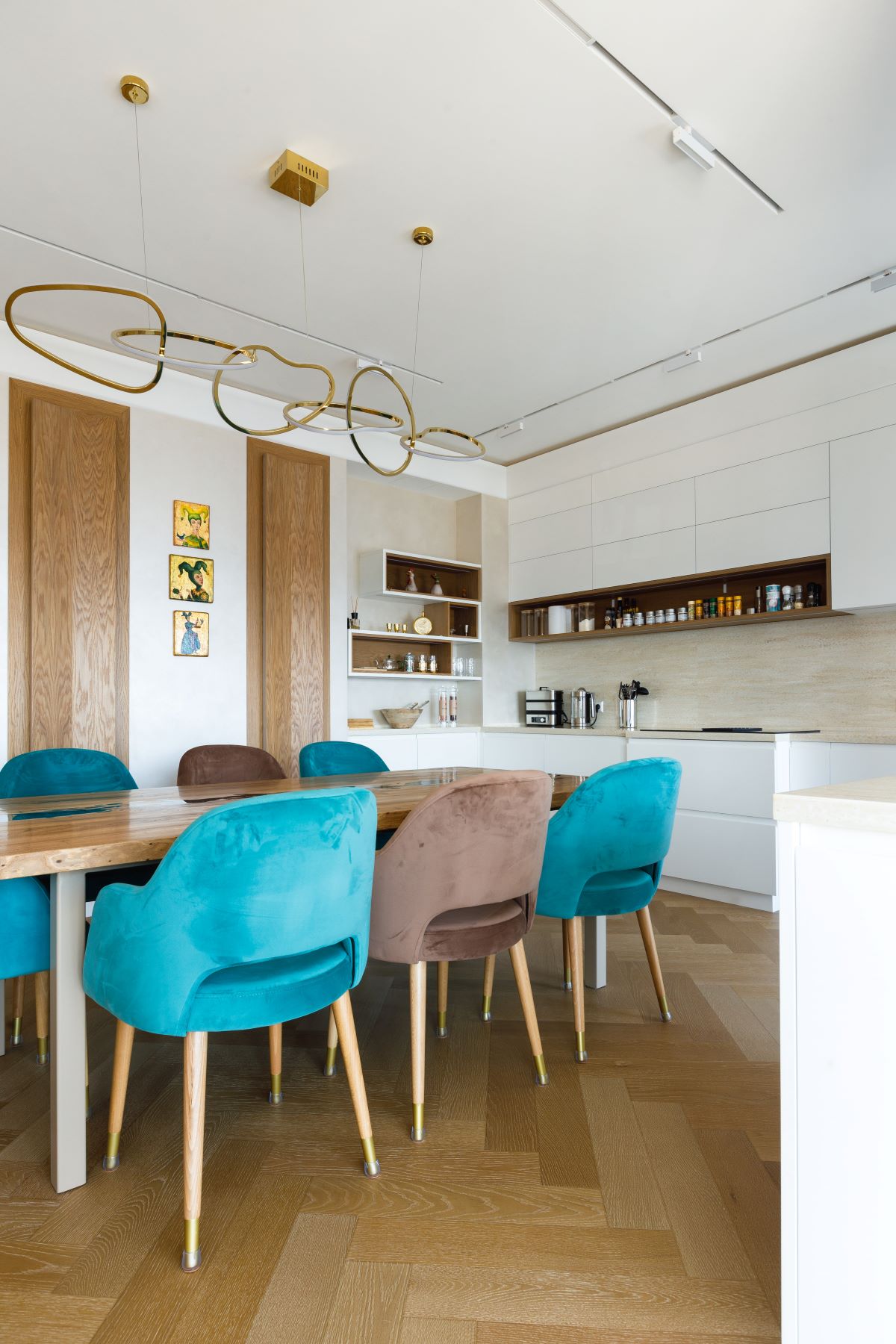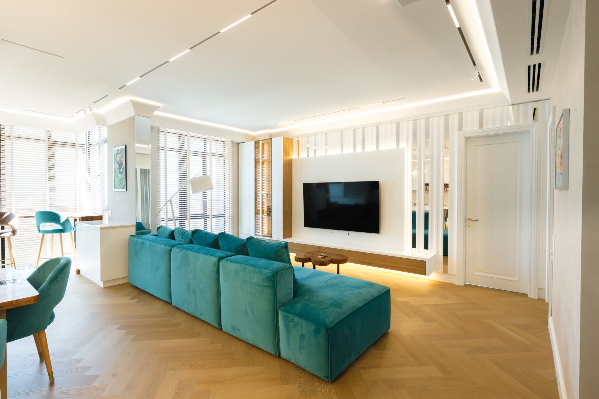 Гармоничный интерьер, наполненный прямыми линиями и световыми акцентами, украшает мебель насыщенного бирюзового цвета.