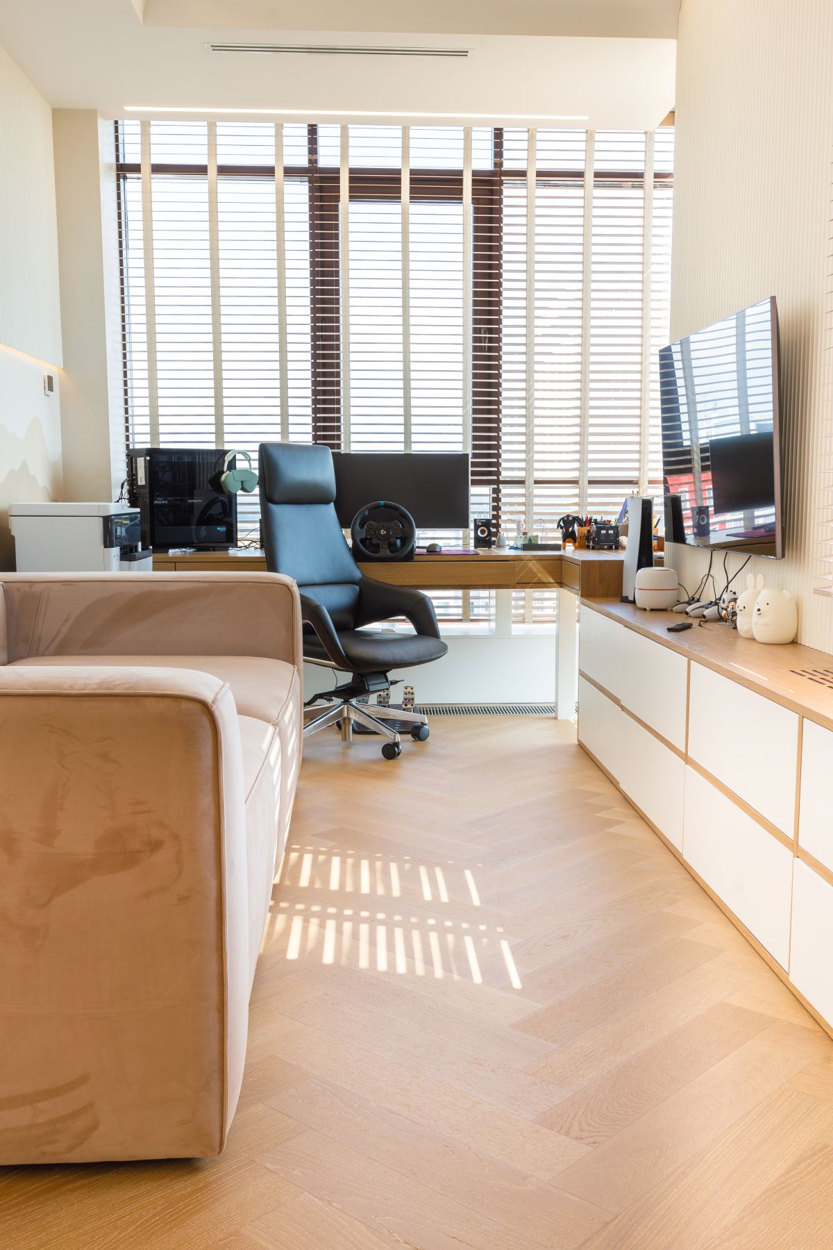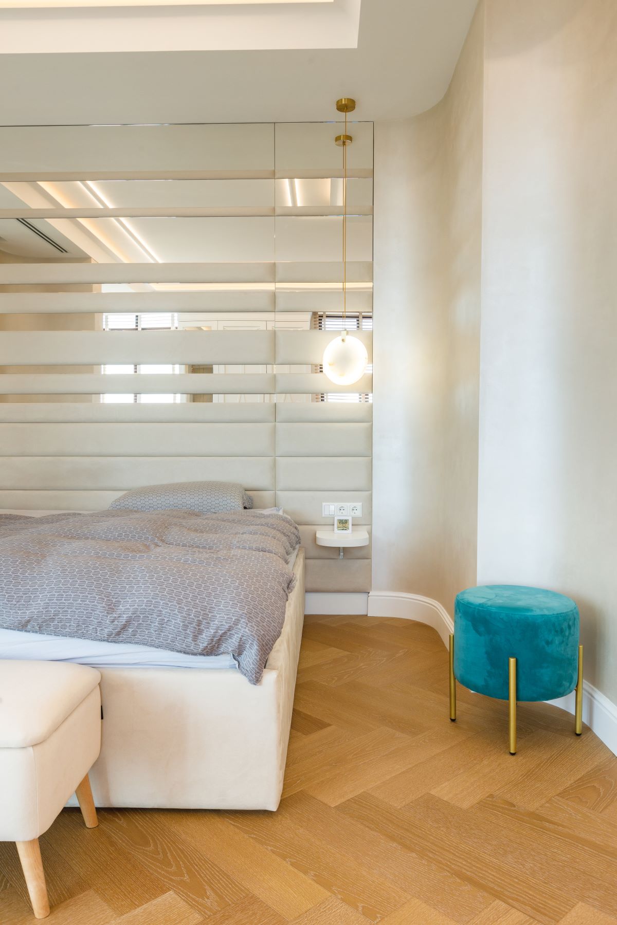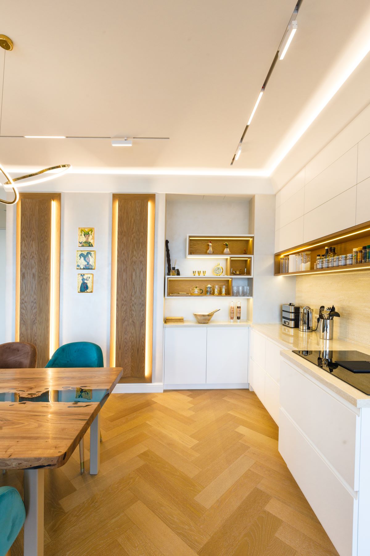 Квартира буквально светится: здесь много солнечного света благодаря окнам в пол и много локальных источников света. Это работает на создание разной атмосферы дома.